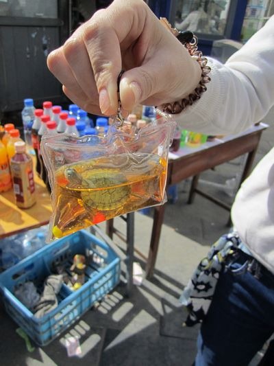 Mengikut laporan media China , benda paling laris di China ialah penyakut kunci (key chain) berbentuk ikan hidup atau kura-kura Brazil dan juga cikcak yang dibalut di dalam plastik. Mereka yang menjual mendakwa air yang terdapat di dalam pastik itu cukup nutrisi untuk hidupan tersebut, tetapi sebenarnya tidak, ia tidak mempunyai gas oksigen dan makanan dan jika bernasib baik haiwan tersebut akan hidup untuk beberapa hari. Lebih malang lagi kegiatan ini diluluskan oleh undang-undang di negara tersebut.